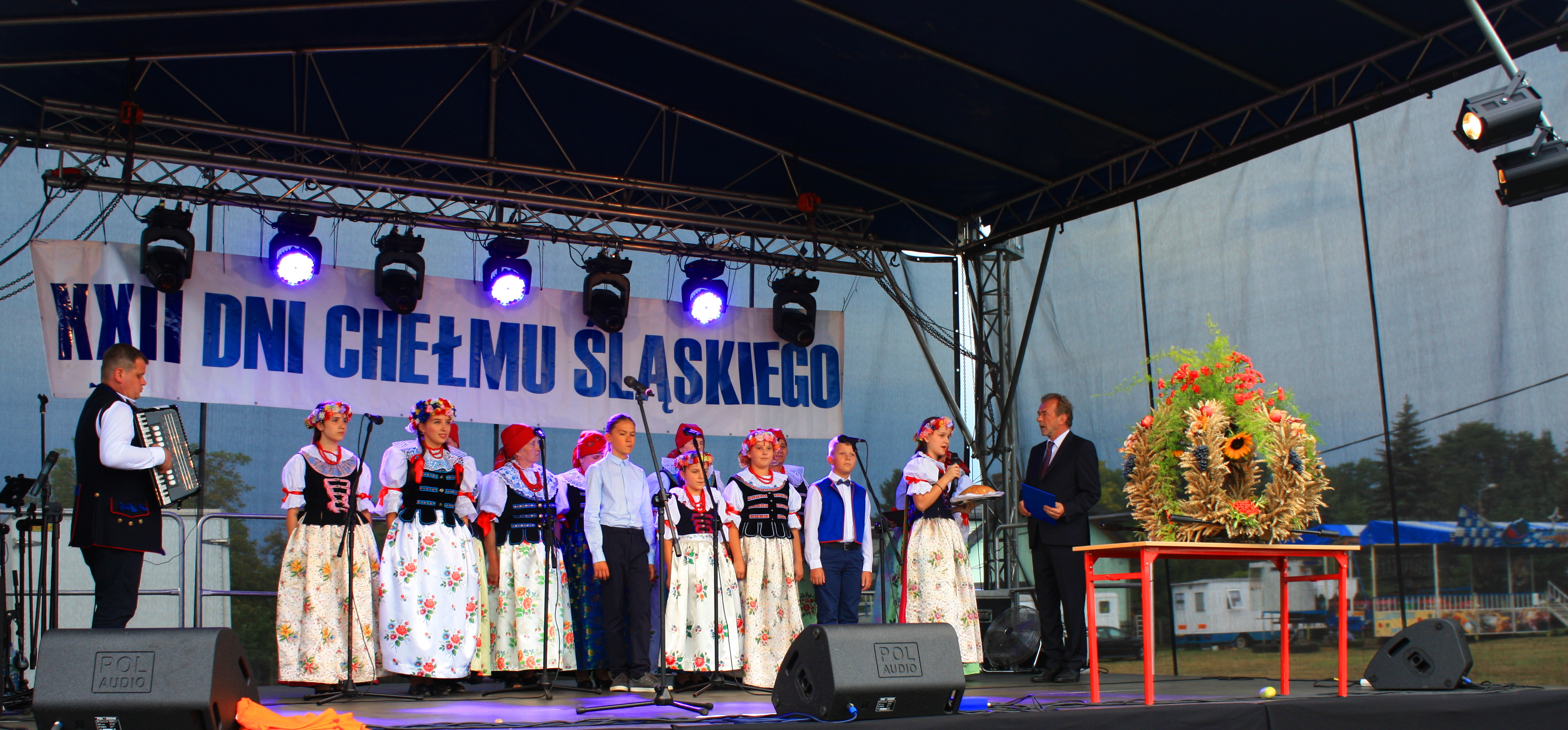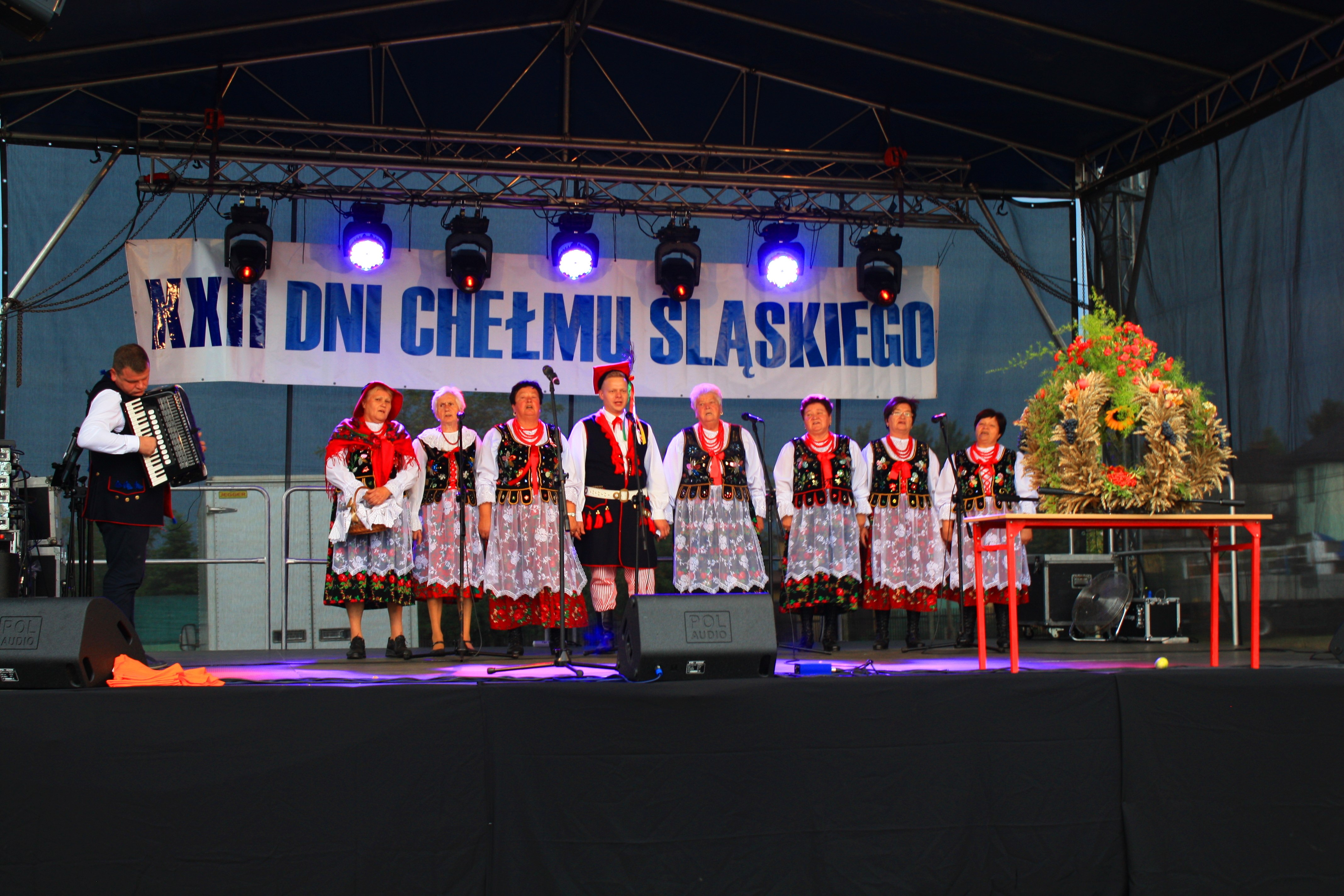 Swój występ miał także zaproszony z Gorzowa Zespół Regionalny „MALWY”, zespół wokalny „GRFNIOKI”, a na przygotowanym na tą okazję parkiecie swoje umiejętności zaprezentowali najmłodsi z zespołu tanecznego „ISKRY” jak również ze szkoły tańca „FLASH”. Na uroczystości obchodów dożynkowych nie mogło zabraknąć Chełmskiej Orkiestry Dętej, która grając znane przeboje umilała czas. Dzięki muzyce można było zapomnieć o niesprzyjającej aurze.
